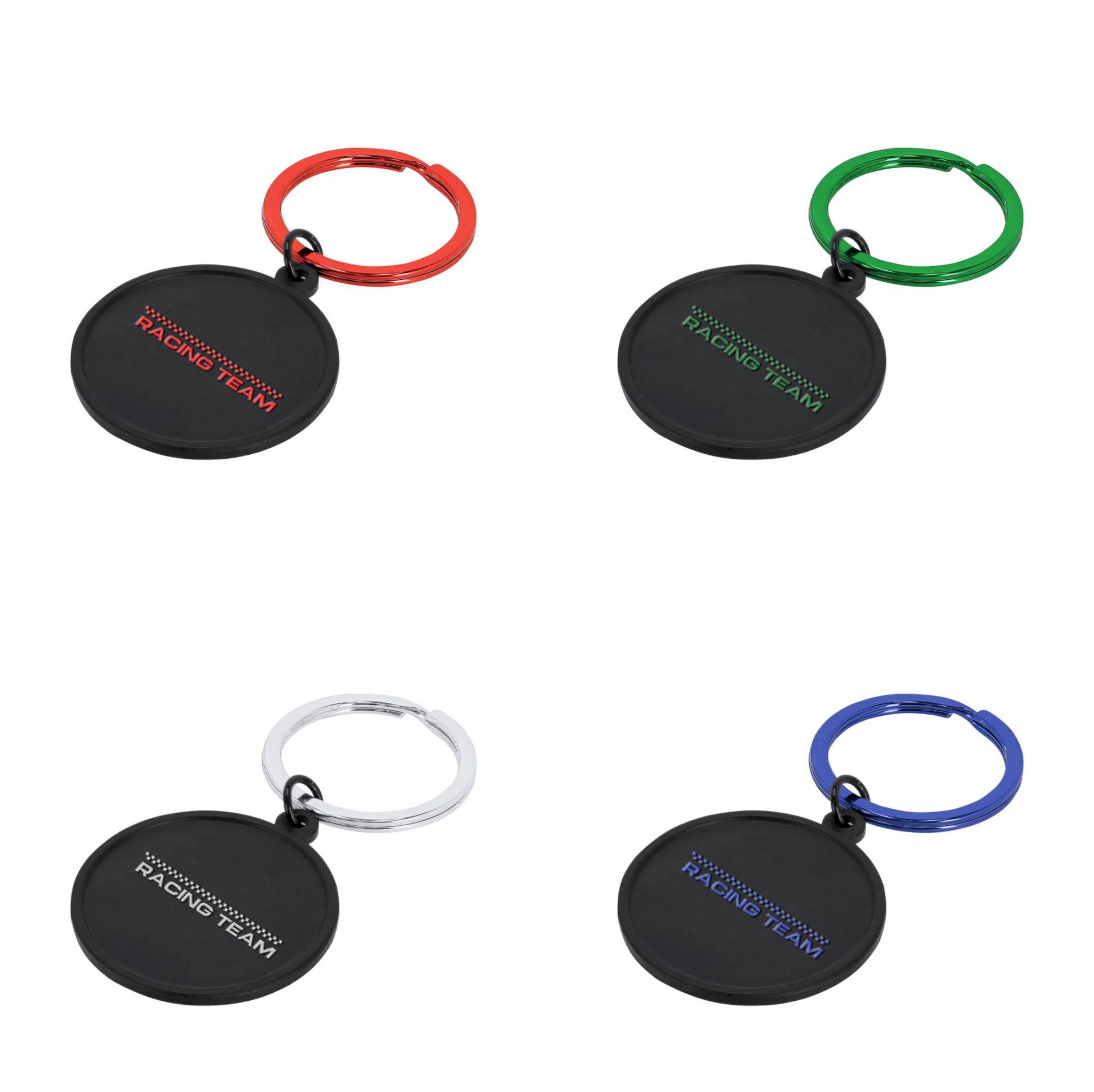 Llavero elaborado en aluminio con diseño redondo en color negro. Ideal para grabado láser con acabado a color. Incluye una anilla metálica a juego para resultado elegante.